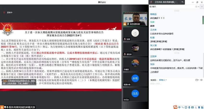 此次“税收云课堂”采取了“理论+实操”的讲解模式,增加了“双向互动”环节。宣讲员围绕近期热门的增值税留抵退税、“六税两费”减免、个人所得税综合所得年度汇算等政策,按照适用类别和范围逐项进行详细解读,同时,设置了“厅线互联动、需求快响应”的互动环节,既解读了税费政策,又解决了企业实操中的问题,纳税人体验感不断升级。