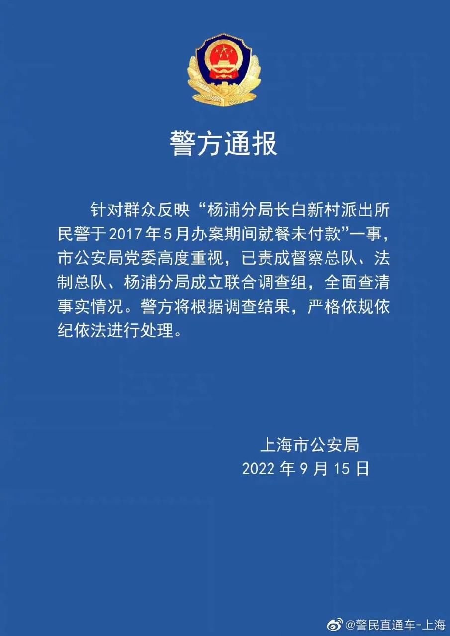 针对群众反映“杨浦分局长白新村派出所民警于2017年5月办案期间就餐未付款”一事,市公安局党委高度重视,已责成督察总队、法制总队、杨浦分局成立联合调查组,全面查清事实情况。警方将根据调查结果,严格依规依纪依法进行处理。